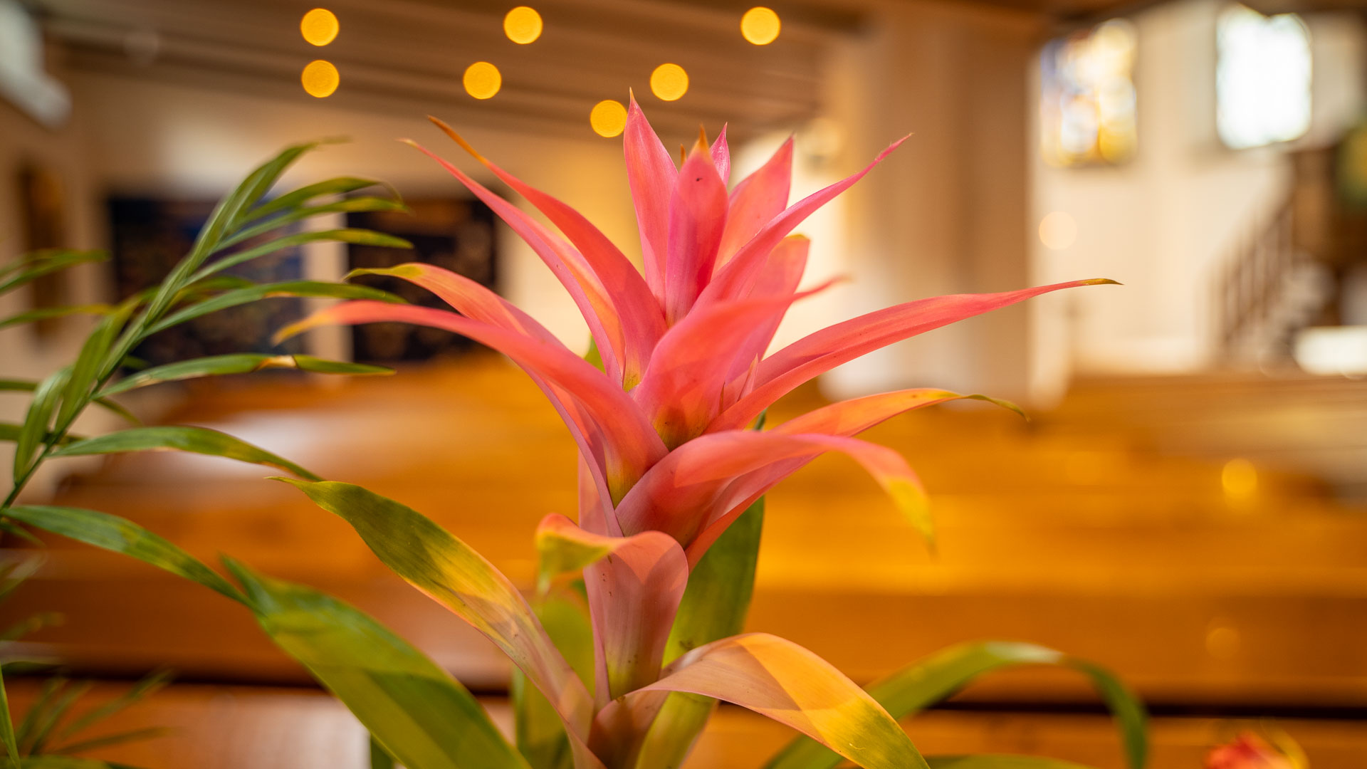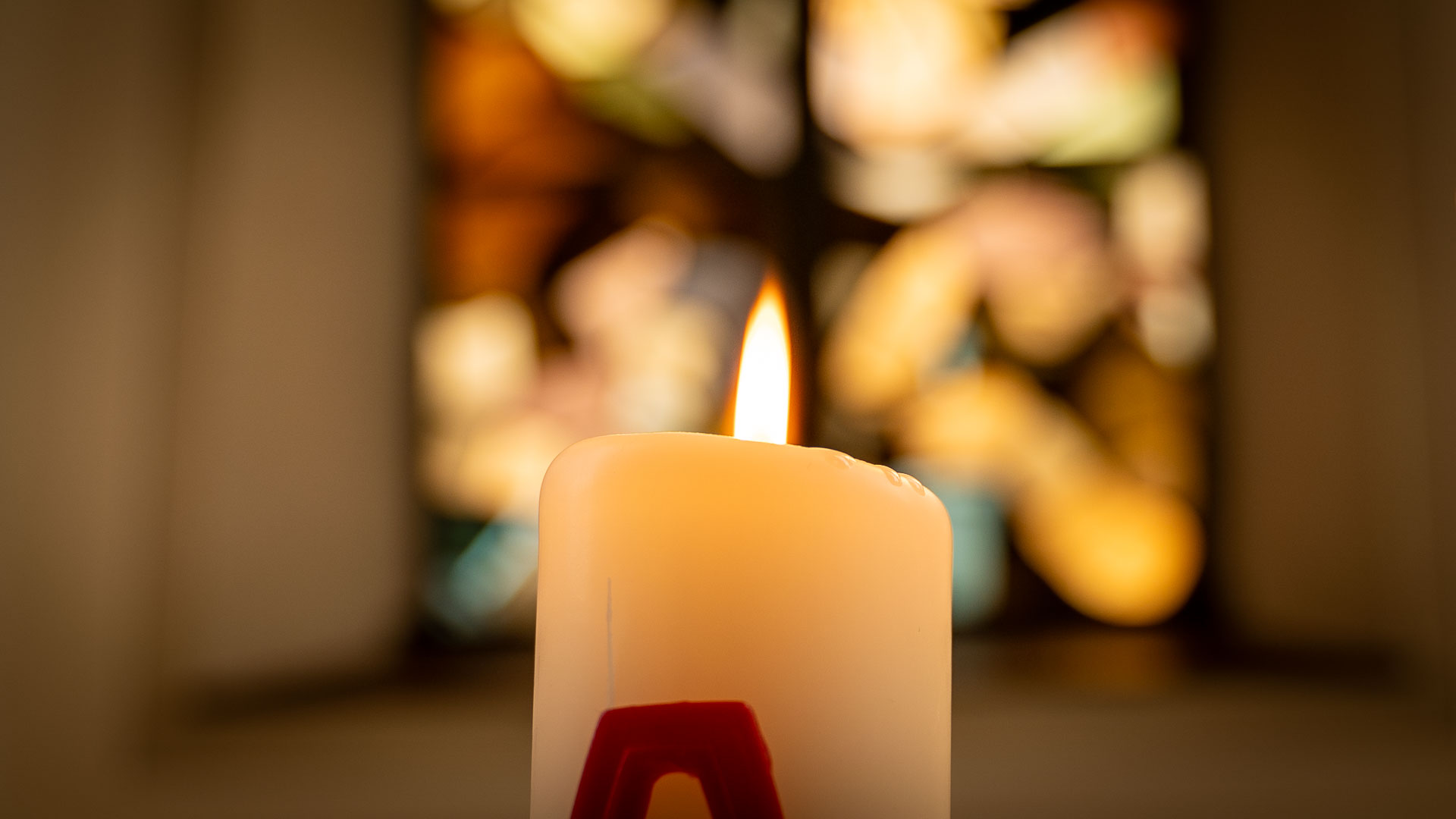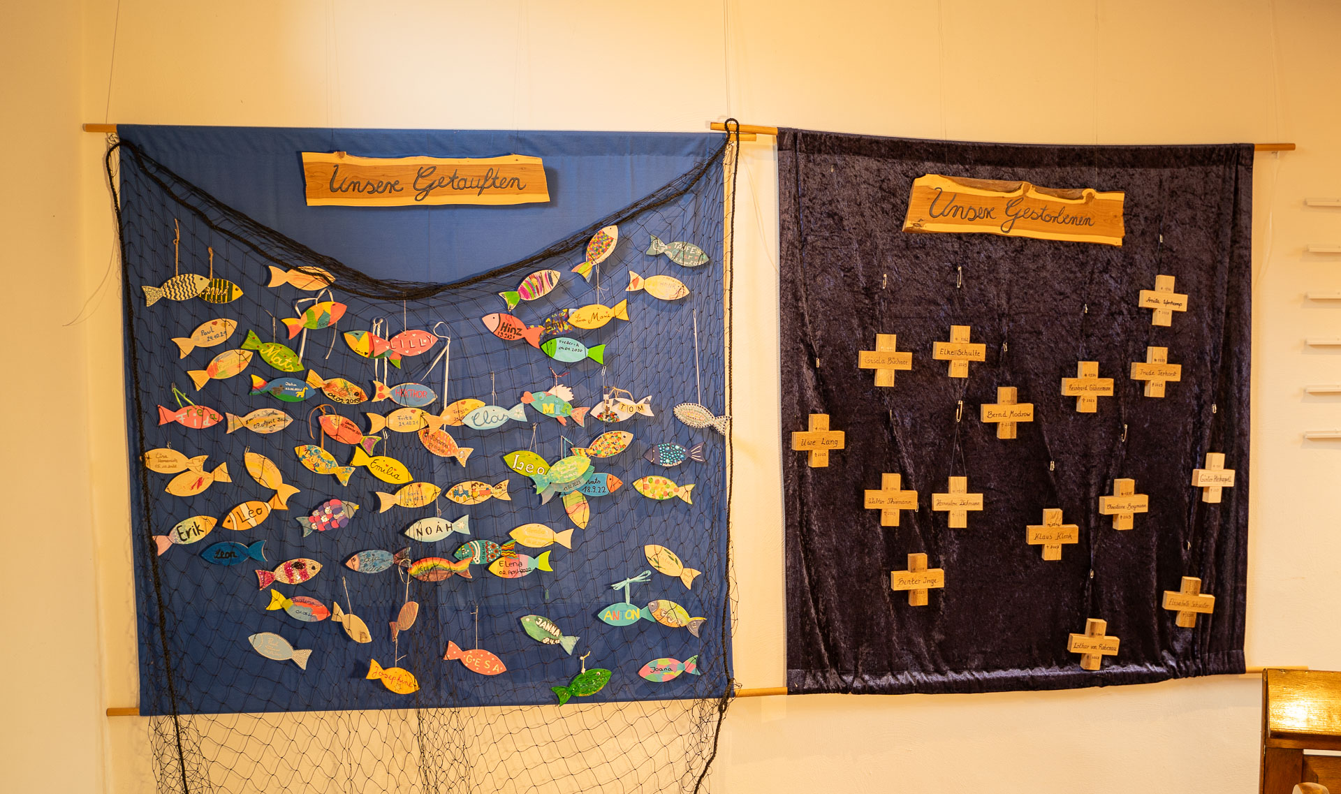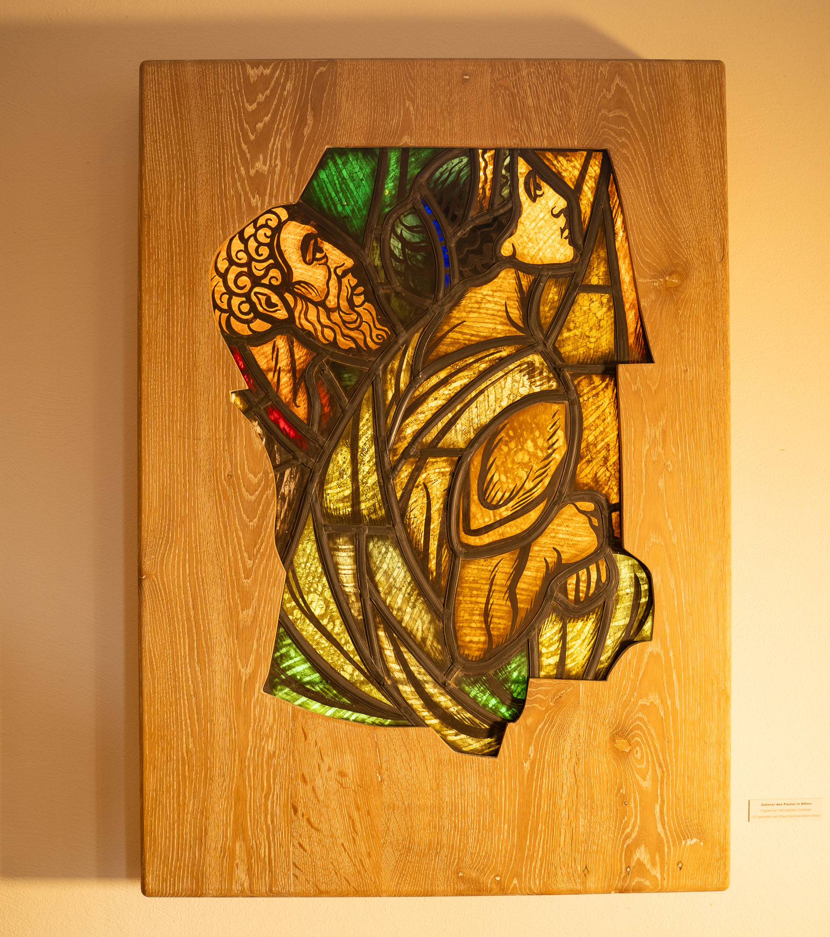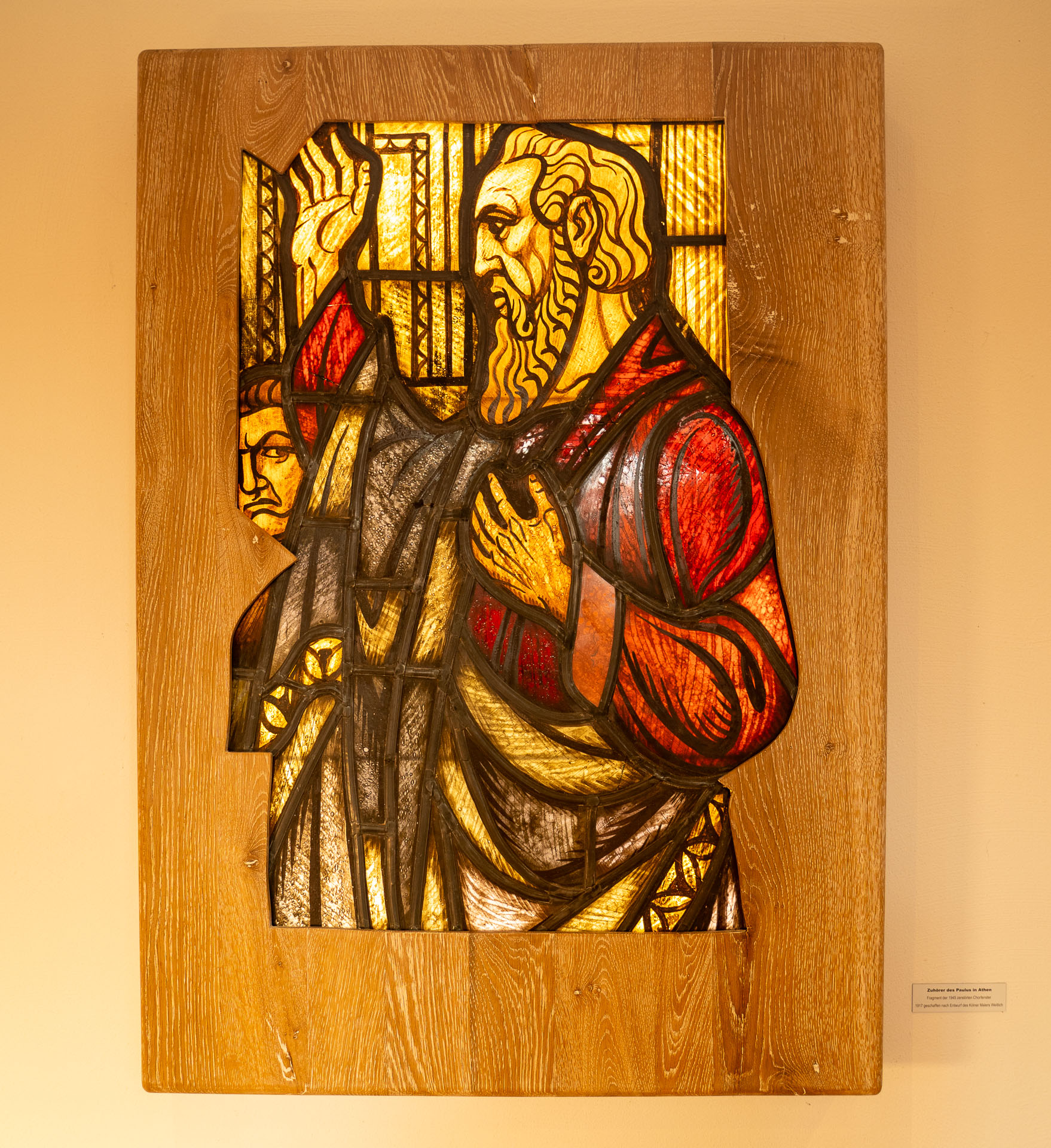 3 der ehemaligen Kirchfenster sind gerahmt im Seitenschiff aufgehängt.