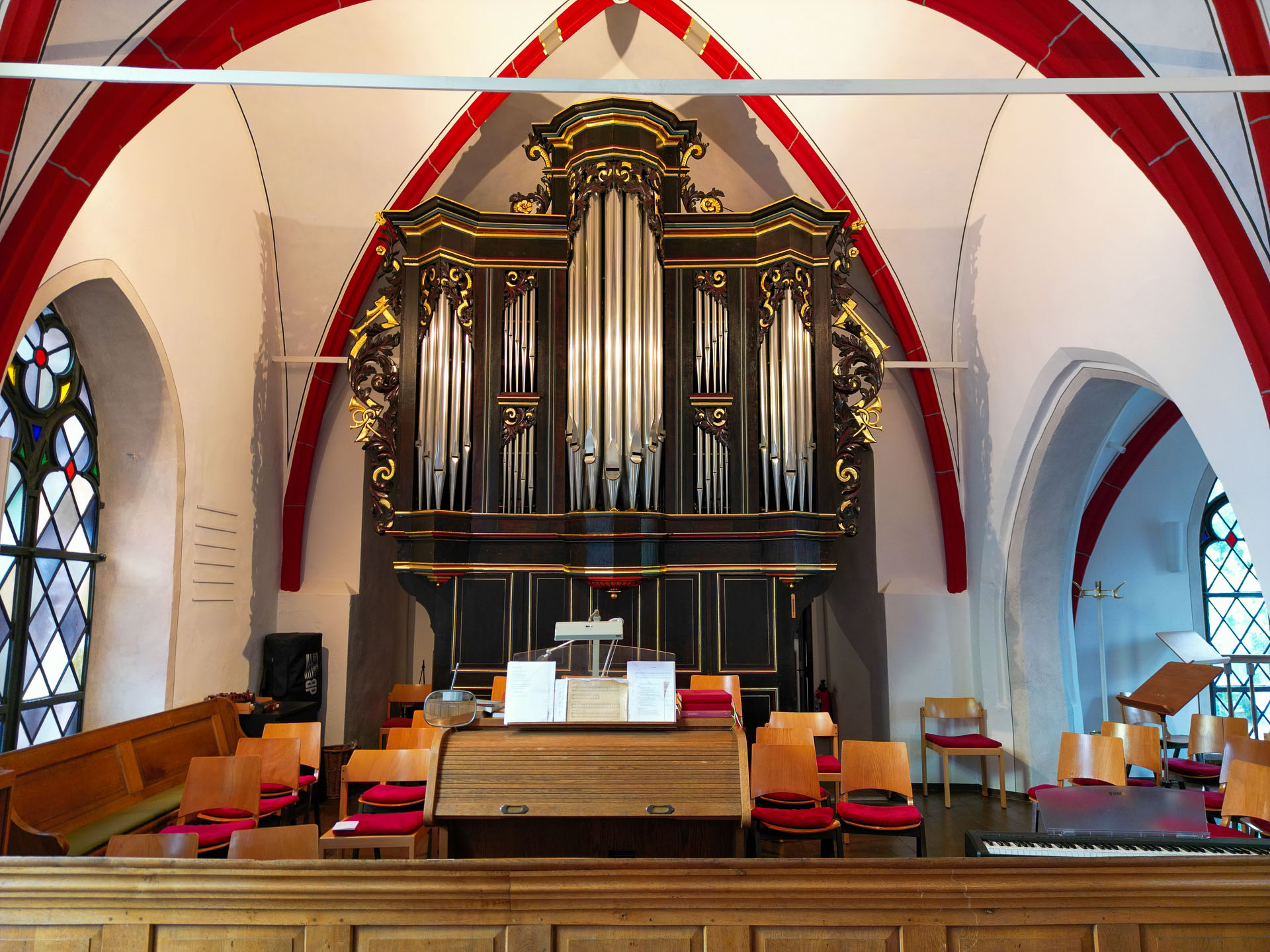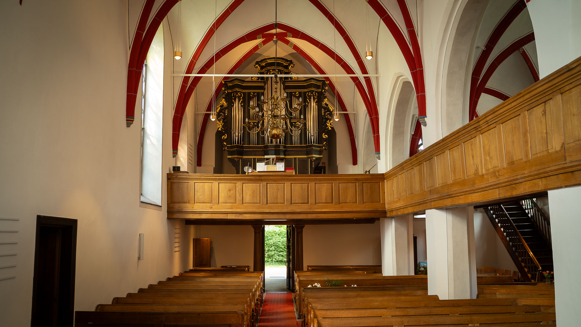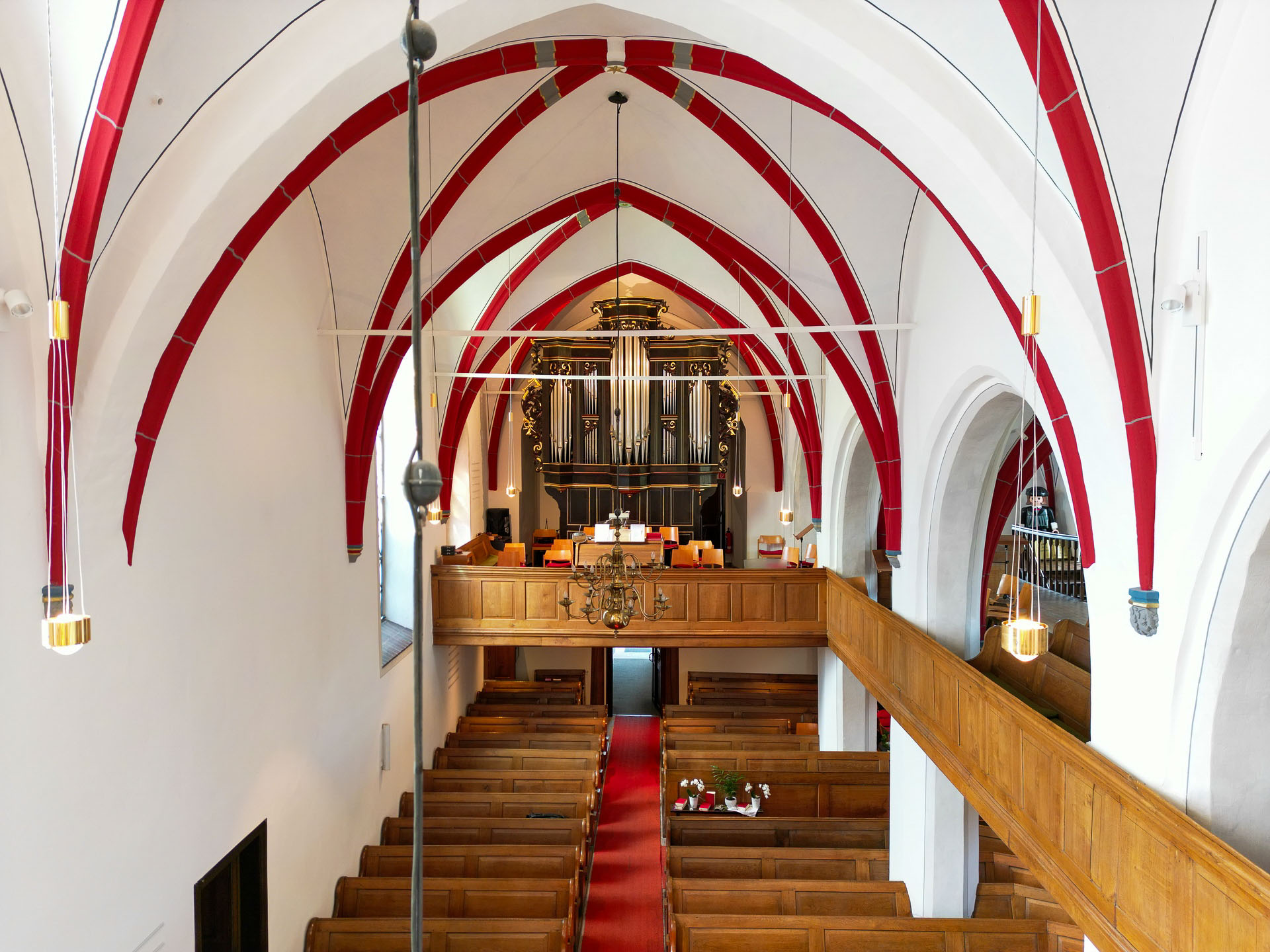 Unsere Kirche ist zweischiffig. Links das Seitenschiff mit Empore.